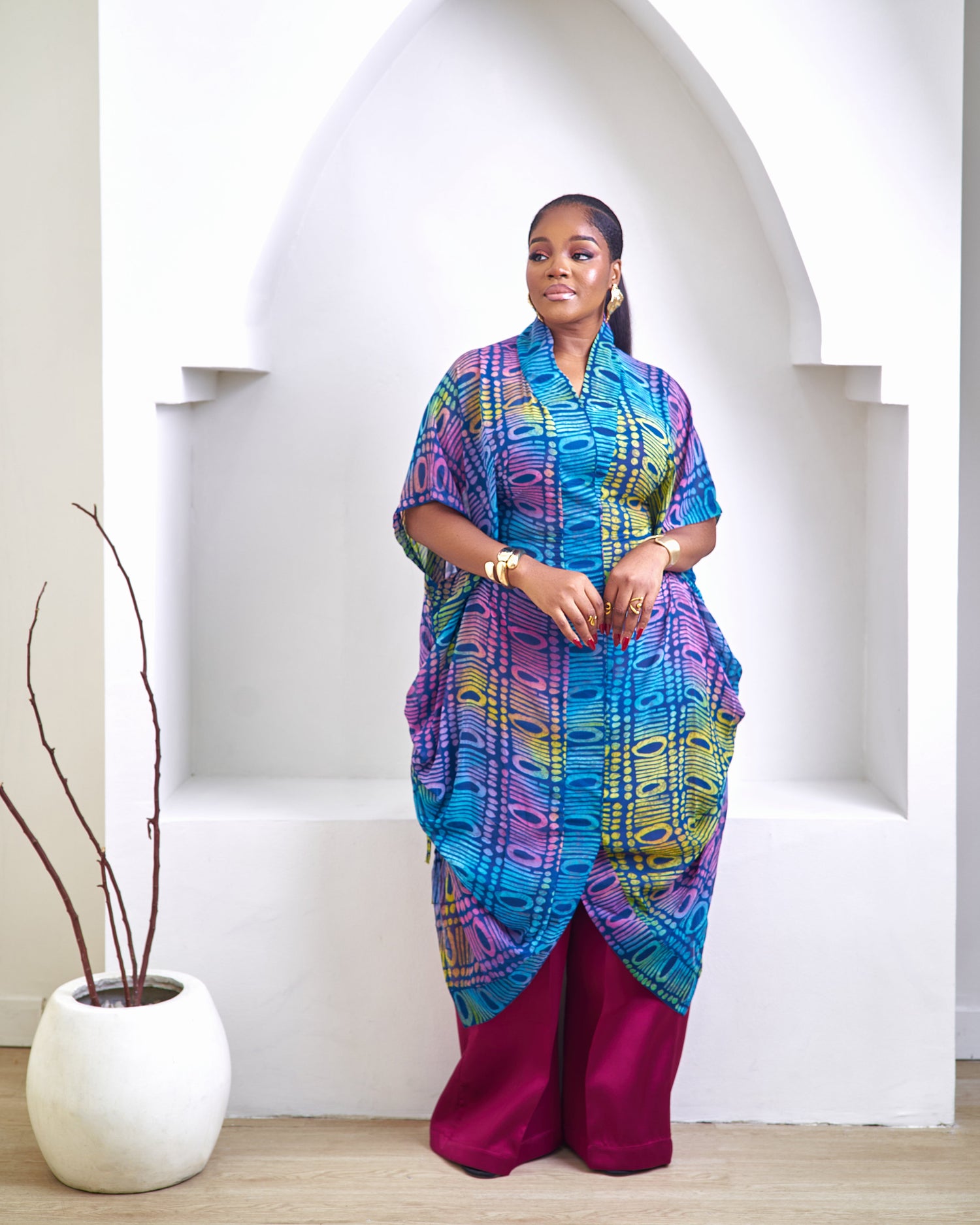 This stylish 2-piece pant set is crafted from vibrant chiffon african print fabric. The top, featuring a draw string boubou long top design. The pants is a luxurious Mikado silk pant measure 45 inches in length and are adorned with pockets on both sides.