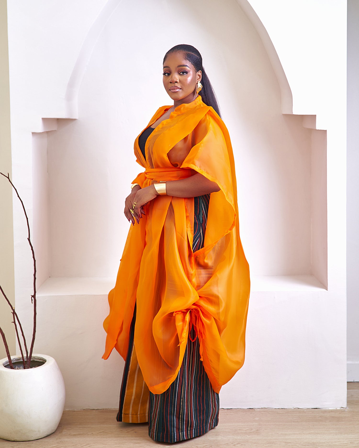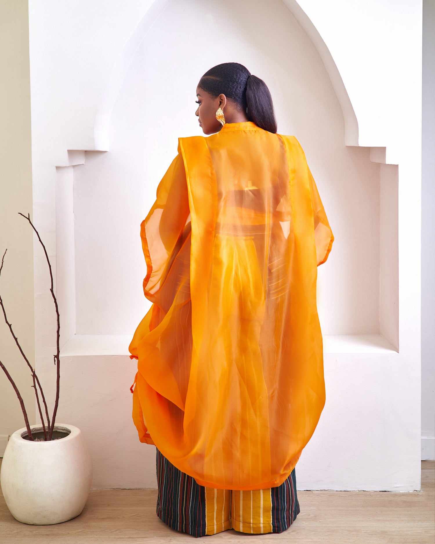 Radiate elegance with this eye-catching African pant set, designed to ensure you stand out with its vibrant design. Featuring a sheer orange overlay with a tied waist and wide, flowing sleeves, this set is paired with striking multicolored striped aso Oke trousers for a bold contrast. The combination of textures and colors adds a unique, sophisticated touch.