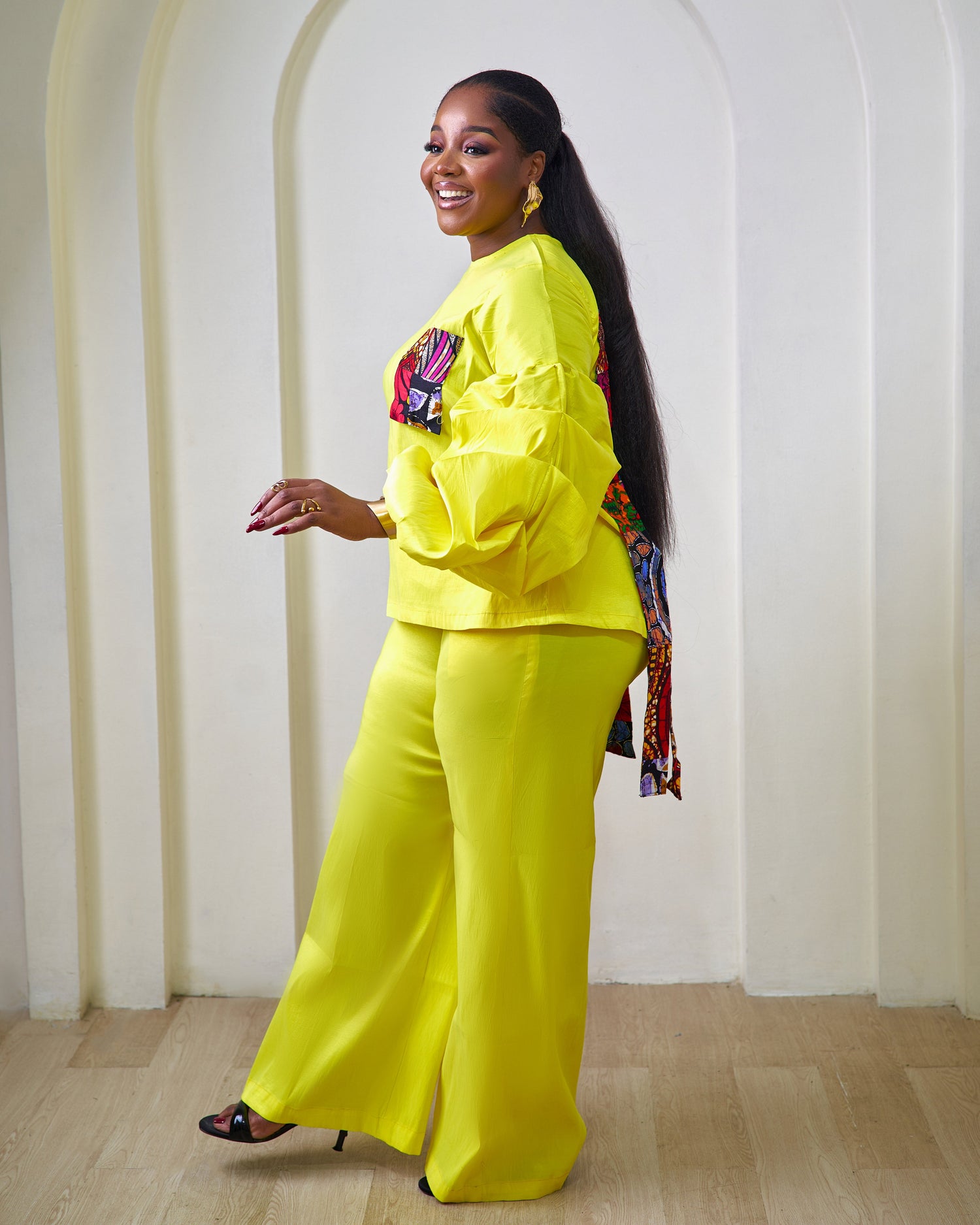 Stand out with this stunning African pant set, designed to make a bold fashion statement. Featuring a striking outfit with voluminous sleeves and intricate multicolored anfrican print patch work accents on the chest and sides, this set includes matching palazzo pants for a cohesive, elegant look. The blend of traditional patterns and modern design adds a unique flair.